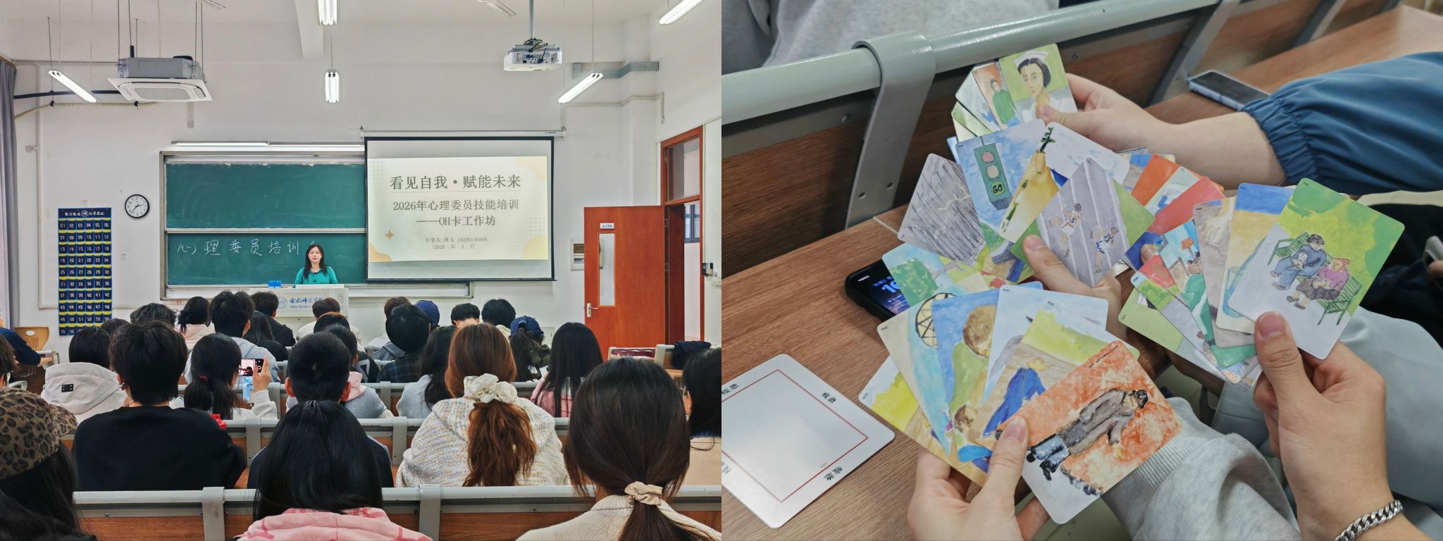 第三专题为《OH 卡工作坊》,由电子信息与集成电路学院辅导员周玉老师带领开展。周玉借助OH卡引导参训心理委员进行自我探索与沉浸式互动,帮助心理委员在体验中提升自我觉察、共情理解与人际沟通能力,为后续开展心理帮扶工作夯实基础。